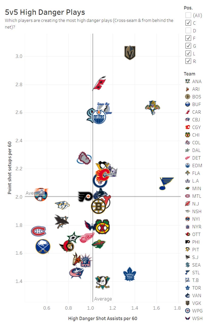 This is how you wear teams down, but what kept them from being in the next tier with teams like Colorado, Minnesota and St. Louis was the lack of sustained offense. They didn’t follow-up their next shifts if they didn’t score on the initial chance and a lot of their offense came from point shots where you’re relying on a rebound or deflection. Linking this back to the All Three Zones data, you can see they rank near the top of the league in “low-to-high” plays or the “non danger zone” as I call it sometimes.