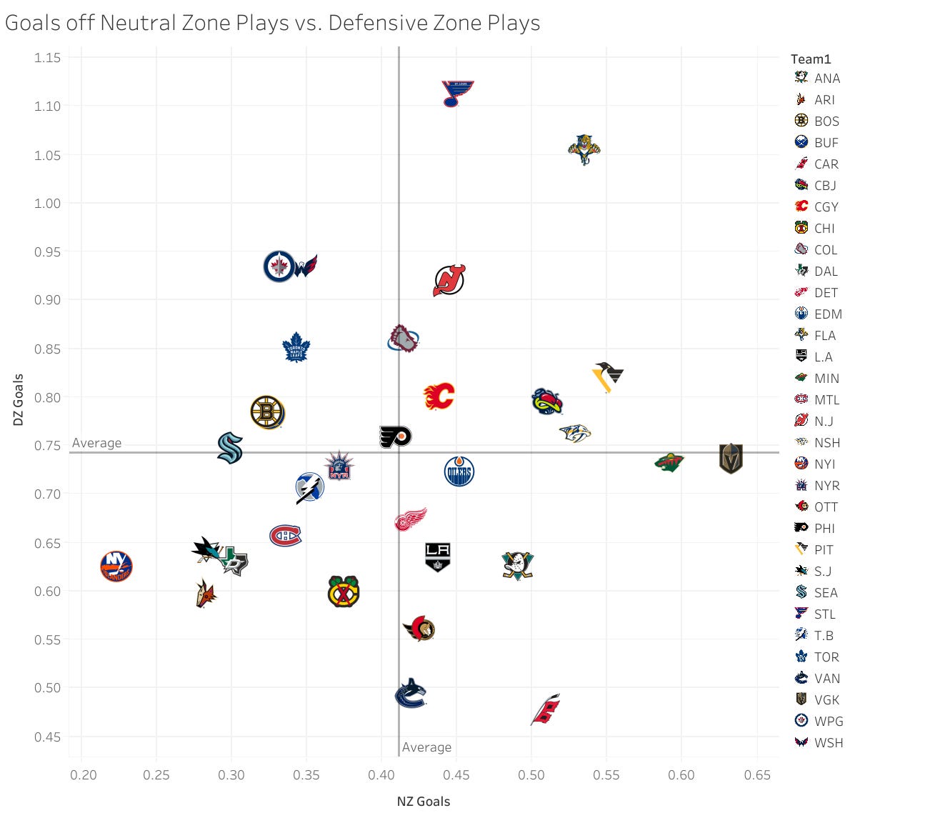 There was nothing wrong with how they played per se, it’s just that you can see that their offense was somewhat one-dimensional even with how good they were off the rush. Owning the neutral zone vs the other two might also be less optimal because so few goals originate from neutral zone plays (or at least they did last year). Something I took note of when researching this project was how good Vegas’ defenders were at “reloading” in the neutral zone to get the puck to the forwards off the rush.