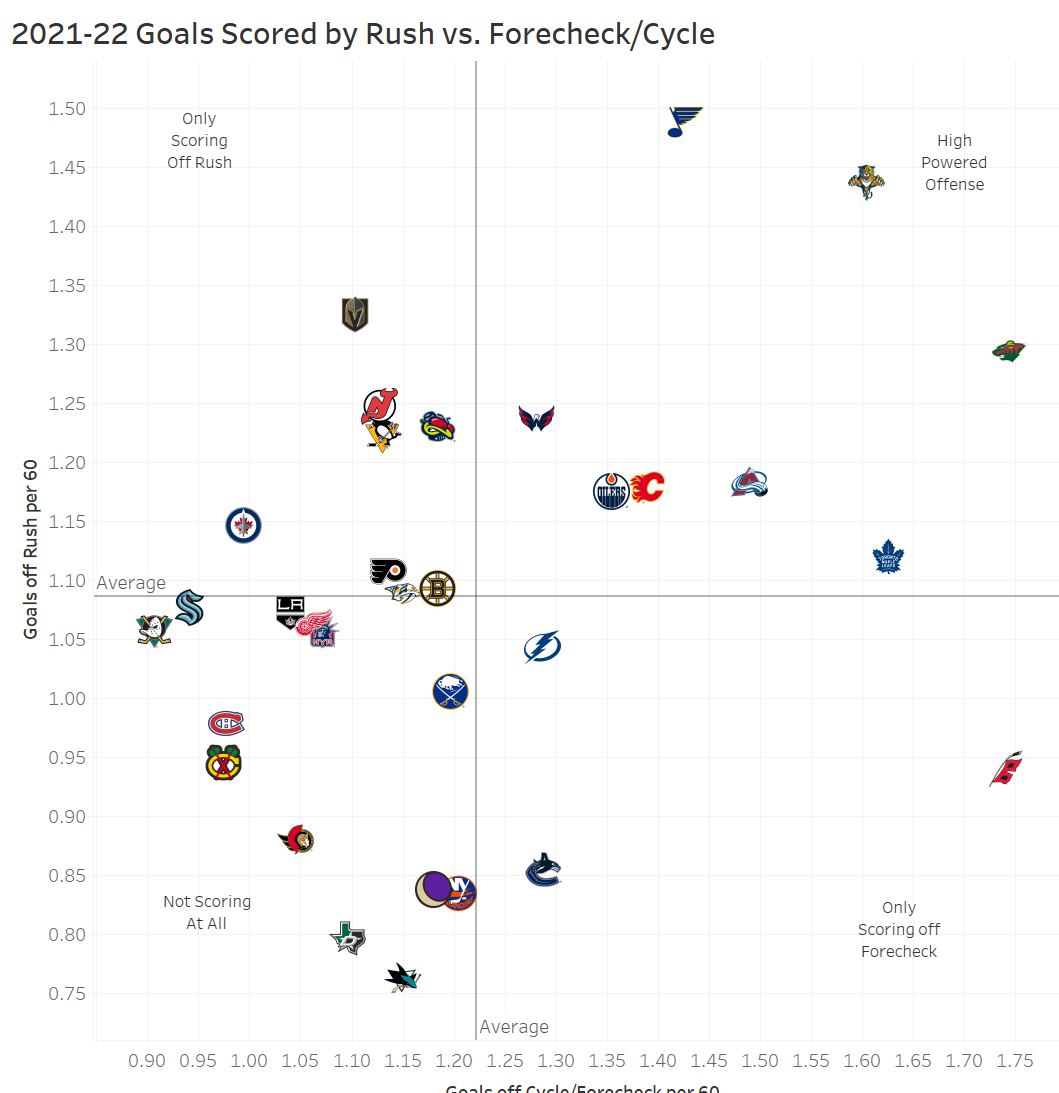 One team I broke down in the presentation was the Vegas Golden Knights, a fabulous team off the rush and one of the few who could generate goals off neutral zone plays. They also missed the playoffs and were in the bottom-half of the league in goals coming off forechecks & cycles. A majority of their rush goals also came from the neutral zone.